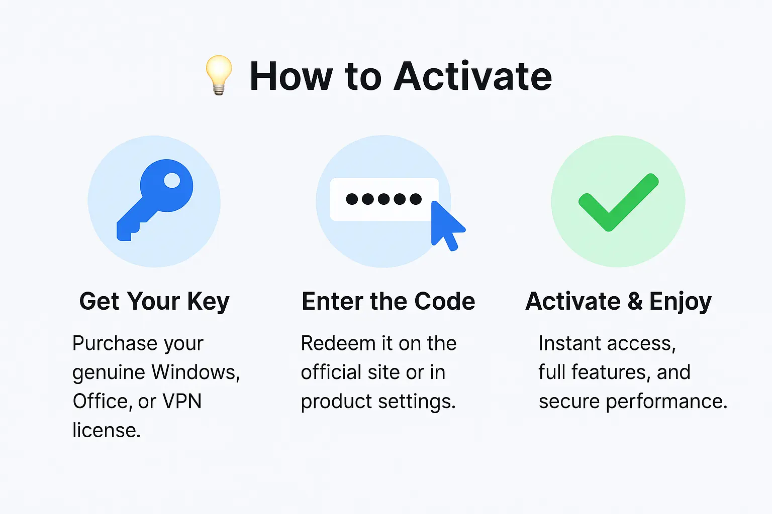 Activate WIN, Office, and VPN products instantly with genuine, affordable digital license keys. Enjoy full features, guaranteed superior performance, and seamless, secure access to all essential tools and online protection.